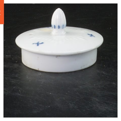Låg til terrin fra Royal Copenhagen forestillende et barn, der ligger på en bakke. Figuren er lavet af hvidt porcelæn. Den måler cirka 16x10 cm.