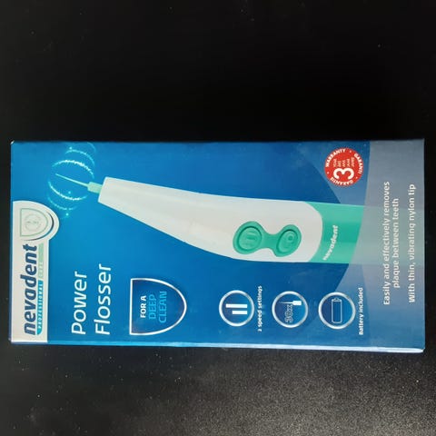 Dette er en elektrisk tandrenser fra Flosser, der kommer i en blå emballage. Den har en længde på 24,5 cm. Produktet har flere indstillinger såsom puls, blød, normal samt en tænd/sluk-knap. Udover tandrenseren indeholder pakken også forskellige mundpleje-relaterede tilbehør, som opbevares i en gennemsigtig plastikkasse.