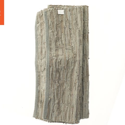 Dette er et vævet tæppe, der måler 210x70 cm. Tæppet har et struktureret design med blandede grå nuancer og er fremstillet af læder, der giver det en robust og rå finish. Det er ideelt til at tilføje et naturligt og rustikt præg til indretningen i hjemmet. Tæppets kant har en fastgjort label med 'DACORE', hvilket indikerer producenten.