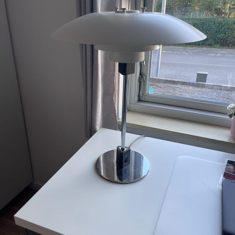 Poul Henningsen: Skrivebordslampe, PH 4/3. Med hvide metalskærme og forkromet stamme og fod. Afbryder ved fod. Fremstillet hos Louis Poulsen. Overskærm diam. 40 cm, H. 55 cm.