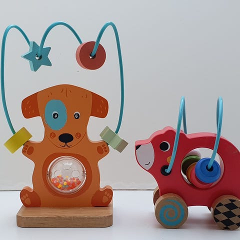 Dette er et stykke trælegetøj med en gennemsigtig plastiksektion i midten, hvor flere små farvede kugler kan ses. Legetøjet har træender, hvor et mønster med farver som grøn, blå, gul og hvid er malet. Legetøjets størrelse er 10 cm. Det er designet til at give visuel stimulering og kan fungere som en spændende genstand for børn. Tags: træ, legetøj, farverig, kugler.