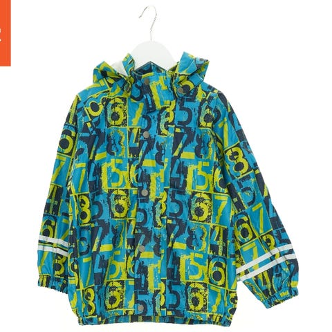Regnjakke i blå farve med lange ærmer og hætte. Jakken har lyseblå ærmer med et mønster og en trykt logo på brystet og bagsiden med teksten 'Airborne'. Jakken har to sidelommer.