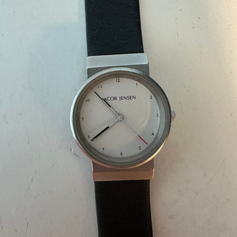 Dette er et klassisk James Lucy armbåndsur med en brun læderrem og en sølv urkasse. Urets diameter er 4 cm og det har et enkelt, hvidt urskive med tydelige visere. Uret kommer i sin originale sorte æske med præget James Lucy logo på låget.