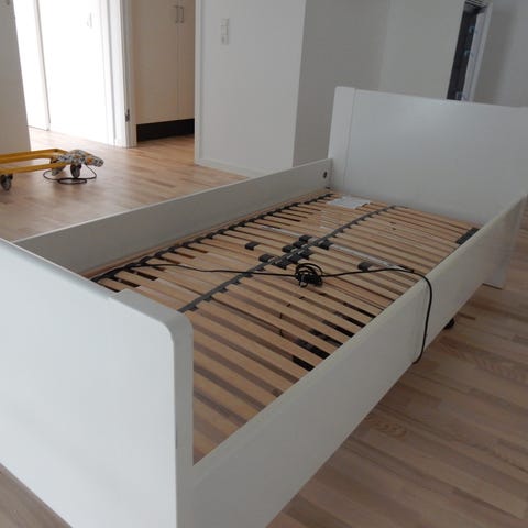 Jysk elevations seng med madras i størrelsen 90x200 cm.