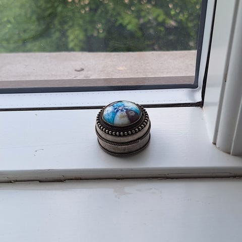 Pilleæske med kompakt design og kunstnerisk udsmykning på låget. Den har en guldfarvet finish og et indvendigt spejl. Æsken har to rum til opbevaring af små piller eller medicin og lukkes med et snaplås. Den er perfekt til daglig brug eller til rejser, hvor der er behov for at have medicin organiseret og sikkert opbevaret.