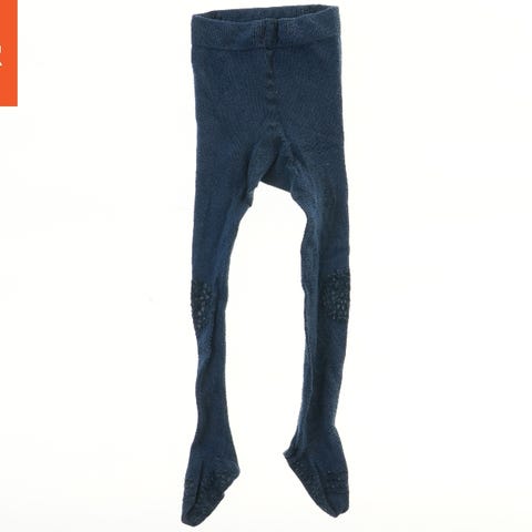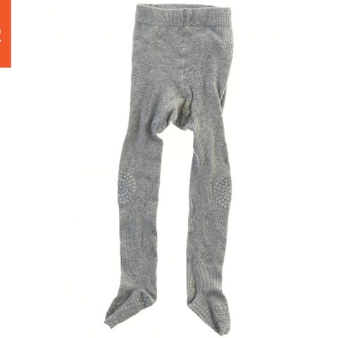 Grå baby bukser med elastisk talje. De har skridsikre prikker på knæene for ekstra sikkerhed under kravleaktiviteter.