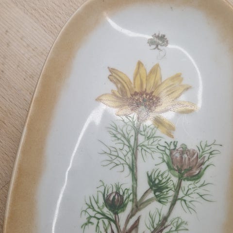 Porcelæn, Gammelt Frugt fad. , Schumann, Med guldkant. Har et par hårrevner, svære at se, men derfor den billige pris. 19 x 31 cm..