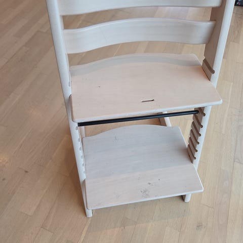 Stokke højstol i træmateriale. Designet til børn med justerbar sidde- og fodplade for tilpasning til barnets vækst.