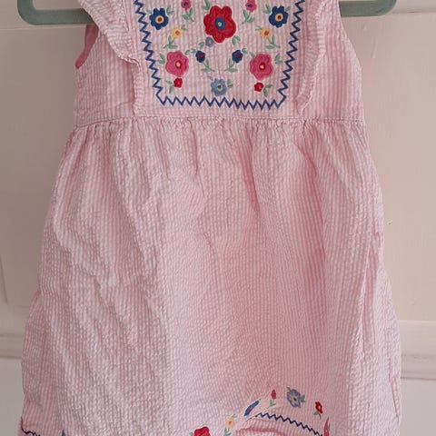 Lyserød kjole med lange ærmer og orange sommerfugleprint. Kjolen har en rund halsudskæring og et taljeret skørt.