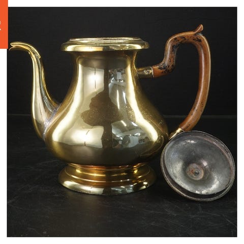 Tekande lavet af messing med et træhåndtag og træknop på låget. Kanden er rund med en tud til hældning og tre små fødder. Låget kan tages af for påfyldning af te eller vand.