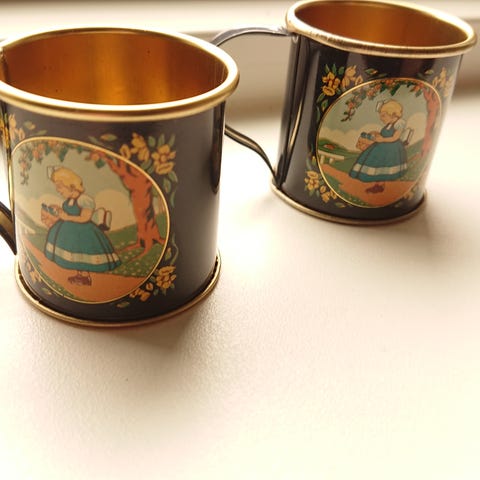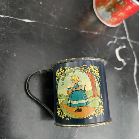 Dette er et lille samlerkrus lavet af metal med en diameter på 4 cm og længde på 4 cm. Kruset har et motiv af en Irmapige indkapslet i en cirkel, omkranset af blomsterdekorationer. Den anden side af kruset har tekst med reklame for Irma. Kruset har en enkelt metalhank. Overfladen på både indersiden og bunden viser tegn på rust og slid, hvilket indikerer dets alder og brug.