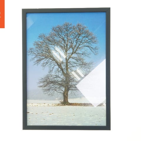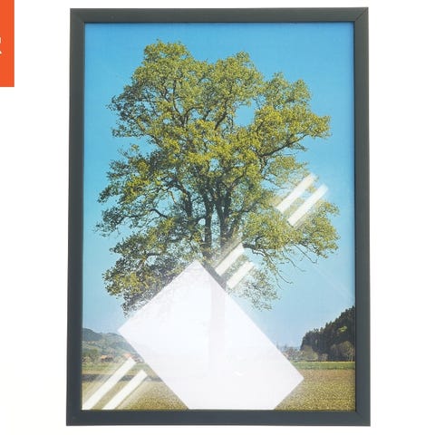 Et indrammet billede af et blomstrende træ i en mark, med bjerge i baggrunden. Rammen er sort og billedets størrelse er 30x42 cm. Bagpå er der en ophængningswire samt en etiket fra 'posterland.dk'.