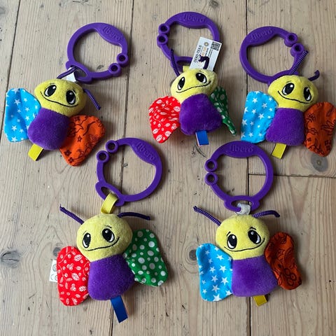 Dette er et aktivitetslegetøj designet til børn, med en farverig og blød dukke formet som en sommerfugl. Dukken har vinger med prikker, en krop i forskellige farver og et venligt ansigt. Der er en clip-on klemme for nem fastgørelse til barnevogne, autostole eller tremmesenge. To vedhæng hænger fra dukken, en rangle med flerfarvede perler og en tekstureret teether, hvilket begge kan stimulere barnets sanser og motoriske færdigheder.