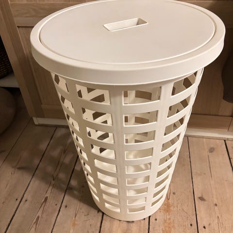 Sort flettet vasketøjskurv med låg og stofindsats