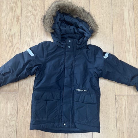 Blå børnejakke fra Didriksons med hætte. Foran findes en lynlås og to lynlåslommer. Jakken har quiltede paneler på brystet og ærmerne samt et logo på ryggen.