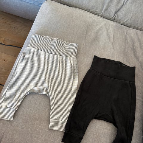 Par hvide babybukser lavet af blødt stof. Bukserne har en bred elastisk talje og ribbet ender ved anklerne, muligvis designet til småbørn eller babyer.