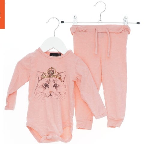 Sættet består af en bodystocking og et par leggings. Begge dele er dekoreret med blomstermønster i nuancer af pink, beige og hvid. Bodystockingen har lange ærmer og flæsedetaljer på fronten. Leggingsene har elastisk talje.