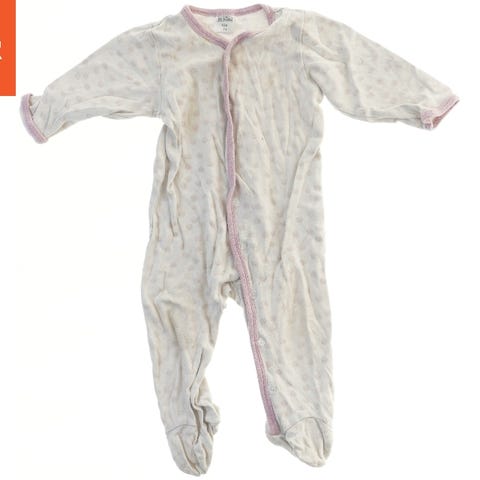 En baby heldragt med lange ærmer og fødder. Dragten er hvid med et mønster af små blomstermotiver i lys blå og lyserød. Den har en krave og lukkes med knapper bagpå.