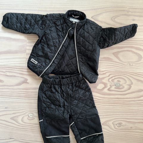 Dette er et sort termoundertøj sæt bestående af en langærmet trøje og et par lange bukser. Begge dele er lavet i materialer der hjælper med at holde på varmen. Størrelsen på sættet er 110, og mærket er Huttelihut. Sættet er ideelt til kolde dage, som underlag når man skal ud i vinterkulden.
