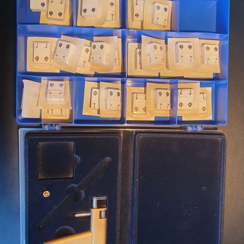 Rengøringskit til skydevåben, inkluderer forskellige børster, løbssnorer, en dåse til solvent, rensenåle og andre tilbehør. Kitet kommer i en grøn plastikæske samt ekstra emballage.