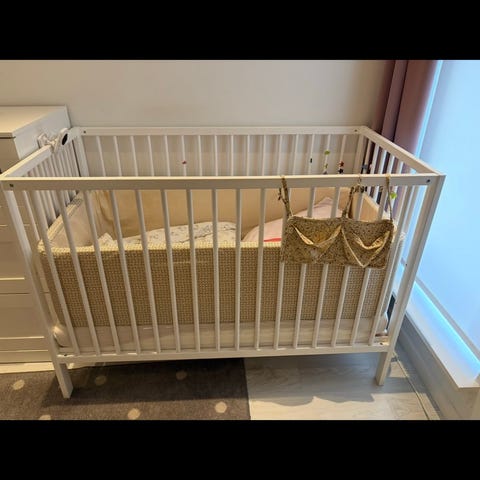 Klassisk hvid tremmeseng fra IKEA med ny madras.