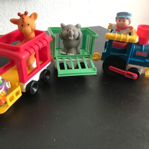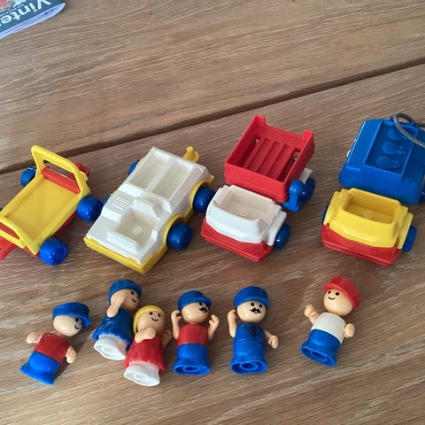 Fisher-Price Little People legetøjsfigurer og biler i forskellige farver. Sættet indeholder små figurer og tilhørende køretøjer, designet til børns leg og motoriske udvikling.