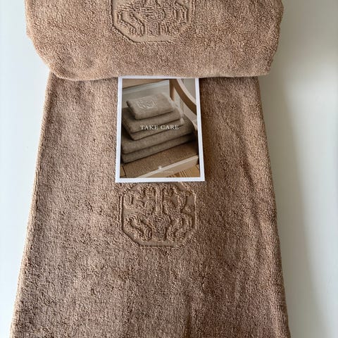 Pakke med 2 stk ekslusive badehåndklæder fra Georg Jensen damask Terry i farven light oak. Helt nye og ubrugte. 70x140cm.