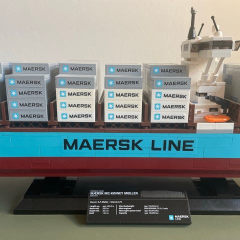 LEGO Creator Maersk Line containerskib i LEGO. Modellen forestiller et containerskib med Maersk Line branding, inklusive detaljerede containere og skibets struktur. Velegnet til samlere og LEGO-entusiaster.