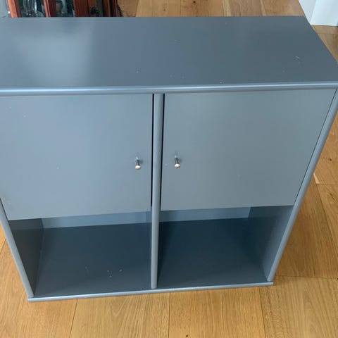 Mistral væghængt reol med sort overflade, en åben hylde og to skuffer med træfront i sæbebehandlet bøg. Reolen er velegnet til opbevaring i entré, stue eller andre rum. Næsten helt som ny.