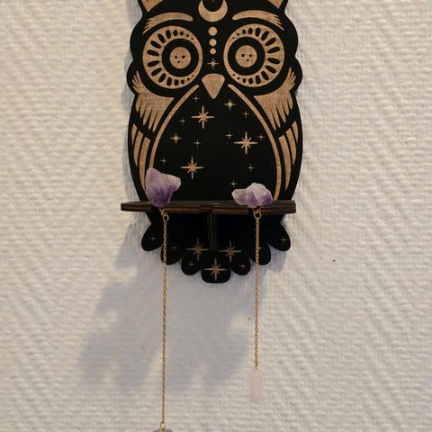 Flot kattehylde inkl. ametyst kæder med en ørn i bjergkrystal og en bjørn i rosakvarts. Yderst dekorativ og der er plads til en større sten på hylden.