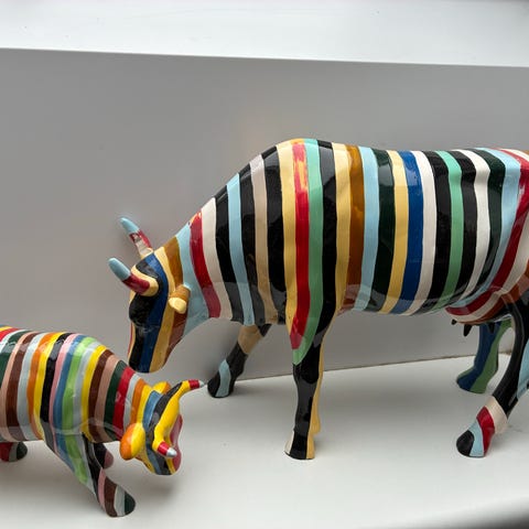 Farverig ko- og kalvemodel med stribet mønster i flere farver. Modellerne er detaljerede og designet til dekorative formål.