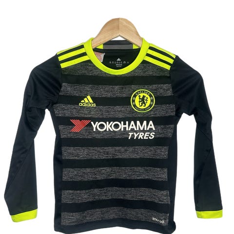 Chelsea FC tørklæde og flag i blå og hvid farve. Tørklædet har striber og flaget har Chelsea FC logo og tekst. Materialet er ikke angivet.