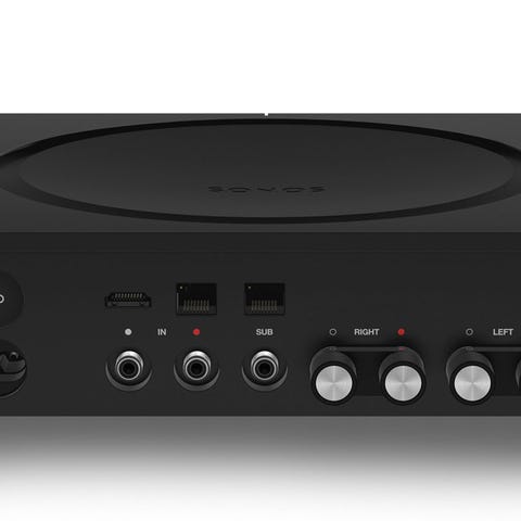 Sonos Connect lydmodtager med flere tilslutningsmuligheder inklusive Ethernet, RCA og højttalerterminaler. Enheden er designet til at integrere eksisterende lydudstyr med Sonos multi-room lydsystem.