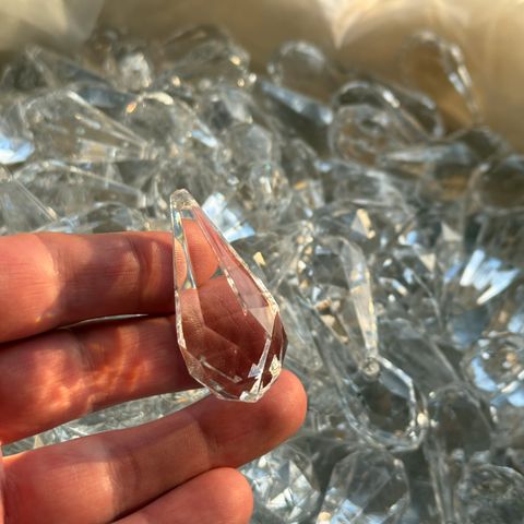 Sæt bestående af klare krystalknapper og perler i forskellige størrelser og facetter. Materialet er gennemsigtigt og anvendes til dekoration eller håndværksprojekter.