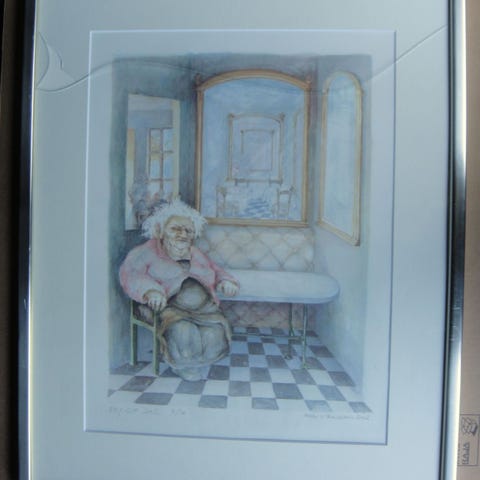 Helle W. Erichsen litografi fra 1980. Grafisk kunstværk med motiv af tre personer. Værket er signeret og dateret af kunstneren. Indrammet med passepartout og træramme. Rammemål:55X55 cm