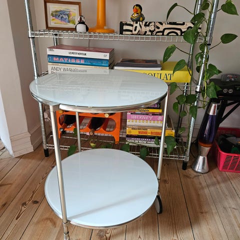 Space Age barbord af franske Marc Held, fra 1970’erne. Råhvid akryl og med røgfarvet glas på toppen og hjul under.