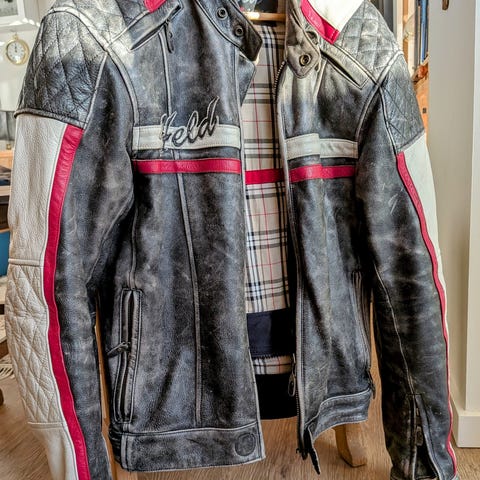 Held 76. Cool vintage kvalitets motorcykeljakke. Beskyttelse i skuldre og albuer, der kan indsættes beskyttelse i ryggen. Jakken har lynlåslommer med ykk lynlåse. justerbare stropper ved taljen og detaljer som '76' på ærmet.