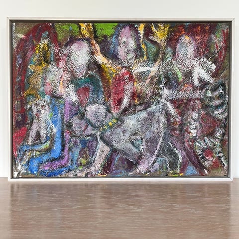 Maleri af en kvinde i gul kjole, siddende med lukkede øjne, med en baggrund der inkluderer en plante og et glas vin. Kunstværket er udført i klare farver med markante konturer.