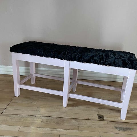 Kopi af Charles Eames bænk med sort polstret sæde i læder. Bænken har knapdetaljer og ben i stål. Der er lidt slitage på sædet.
