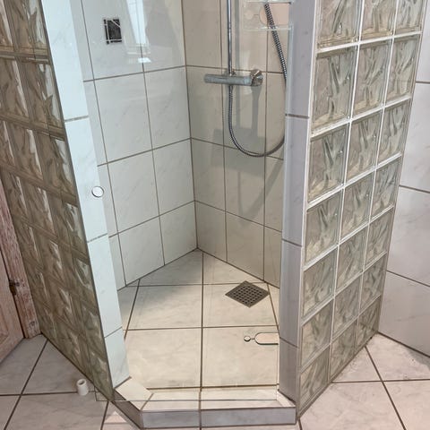 Brusedøre i frostet glas med kromramme og to runde kromhåndtag. Der medfølger skruer til montering.