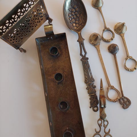 Kæmpe bord med alle mulige messinggenstande lige fra morder kattefigurer pottepotter olielamper kander væg tallerkener og meget mere