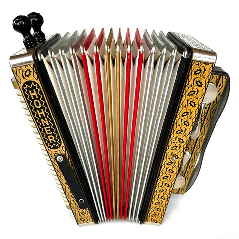 Hohner Corona IIIR knapharmonika i rød farve med detaljer i hvid og sort.
