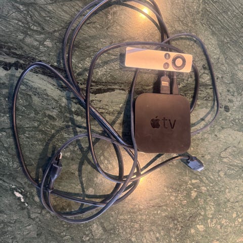 Apple TV streaming-enhed til afspilning af digitale medier på tv. Enheden leveres med original emballage og strømkabel.
