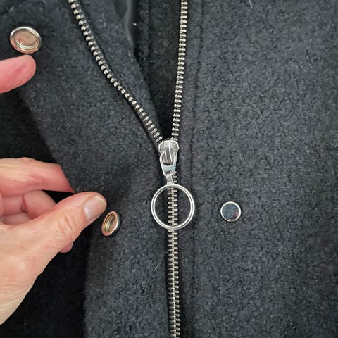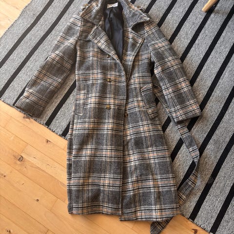 Fin sort frakke str. 42 som lukkes med 3 knapper og med bælte. Har to stiklommer foran og en inderlomme. Mrk. C&A Canda 55% polyester 45% new wool. Frakken er hel og pæn dog har foret et lille hul.