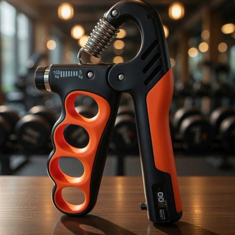 Sæt bestående af to håndtrænere med rød skumgreb. Håndtrænerne er designet til at styrke hånd- og underarmsmusklerne gennem modstandstræning. Helt ny.