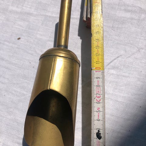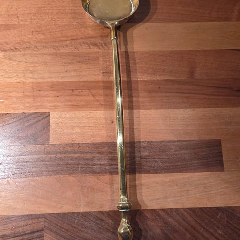Skovl fremstillet i messing med håndtag af træ. Skovlen har en rektangulær form og er velegnet til opgaver, hvor et robust og holdbart redskab er nødvendigt.