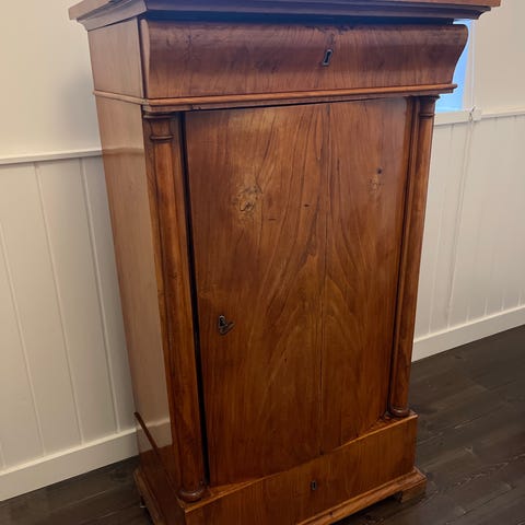 Smukt gammelt skab, så har stået i hjørne, skabet har oprindeligt stået i en gammel Københavner lejlighed i et køkken. VI har brugt det som tøjskab på et børneværelse og har derfor sat et stykke bøjlestang ind nederst. Det er super charmerende og et meget smukt skab. Kommer fra ikke-ryger hjem! (Måler med listen i toppen D: 46,5 - B: 77 cm) Højden 201 cm