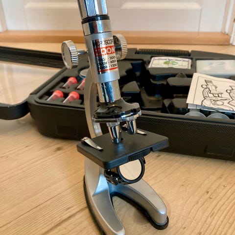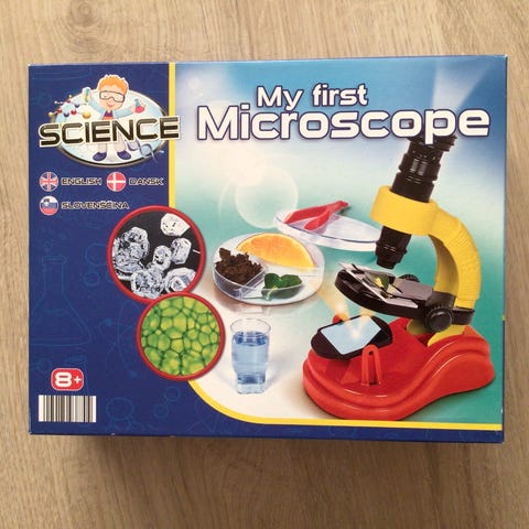 Aldrig åbnet og helt nyt mikroskop sæt. Der er mange dele i.