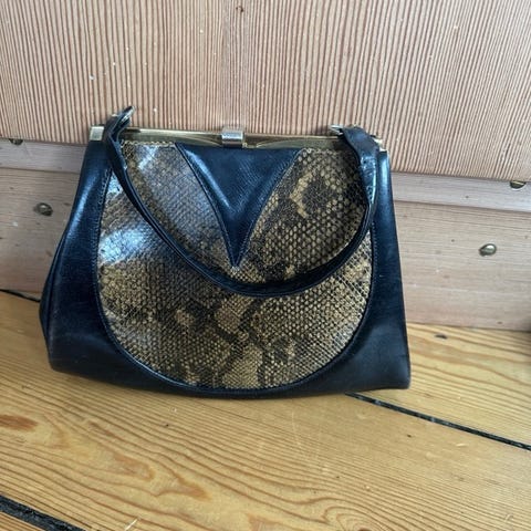 Vintage håndtaske og matchende pung i brun slangeskind. Tasken har to skulderstropper og en lukning med lås i forgyldt metal. Pungen matcher taskens materiale og farve og har en metalrammelukning. Tasken er inddelt i et stort rum, og to mindre rum samt et lynlåslukning. Tasken er fra Jane Shilton lavet i England.