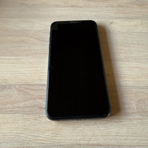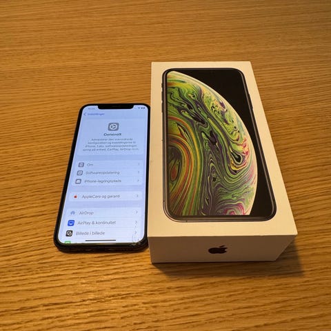 Apple iPhone XS smartphone med 64 GB lagerplads. Enheden har en sort finish og inkluderer oplader.